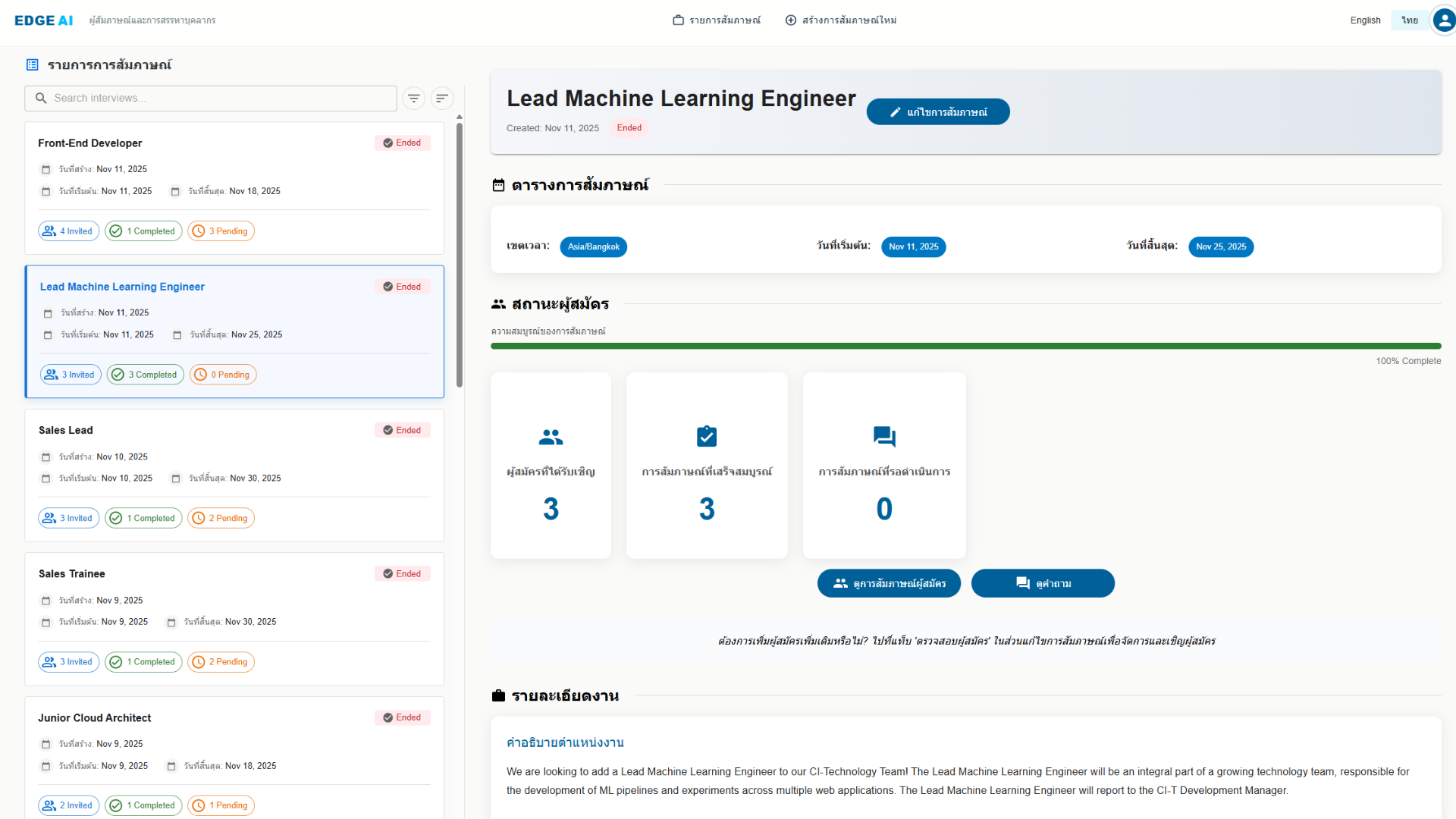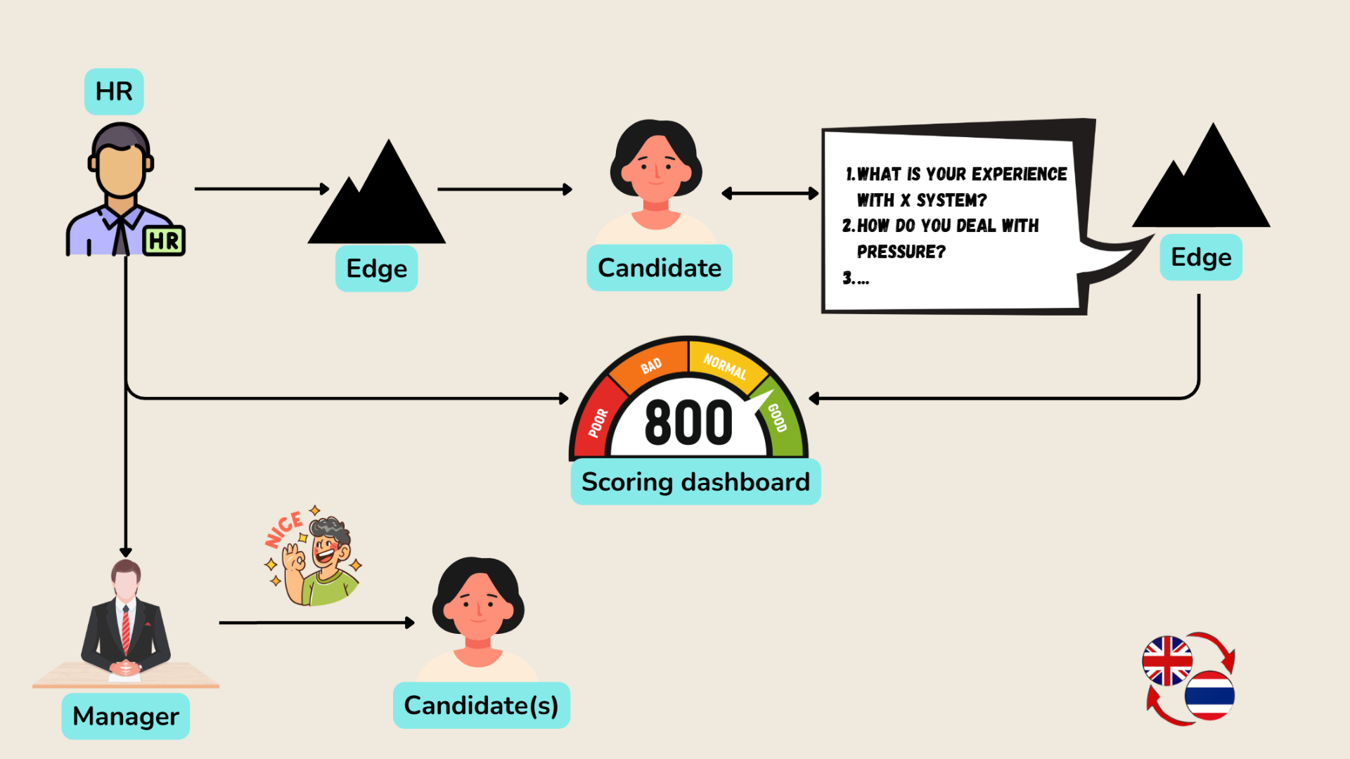 Edge transforms the traditional recruitment process by performing automated screening on any number of candidates through a holistic evaluation combining resumé content, interview answers, technical ability, as well as voice and face evaluation in an unbiased manner.