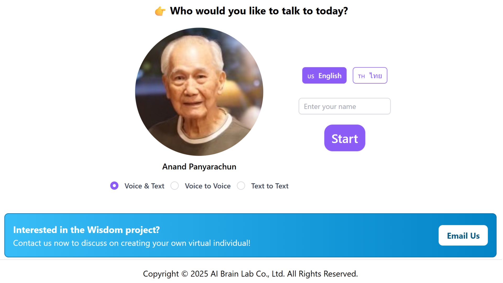 Wisdom is a groundbreaking AI-driven platform designed to preserve and share the invaluable knowledge and insights of influential leaders for future generations. Wisdom employs cutting-edge AI technologies, including Natural Language Processing (NLP) and Generative AI, to create interactive digital twins of esteemed figures.