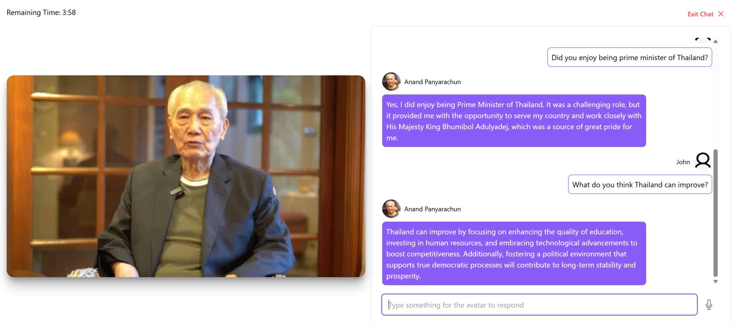Enable transfer of wisdom from people of great prominence to the future generations via direct conversations with AI clone.